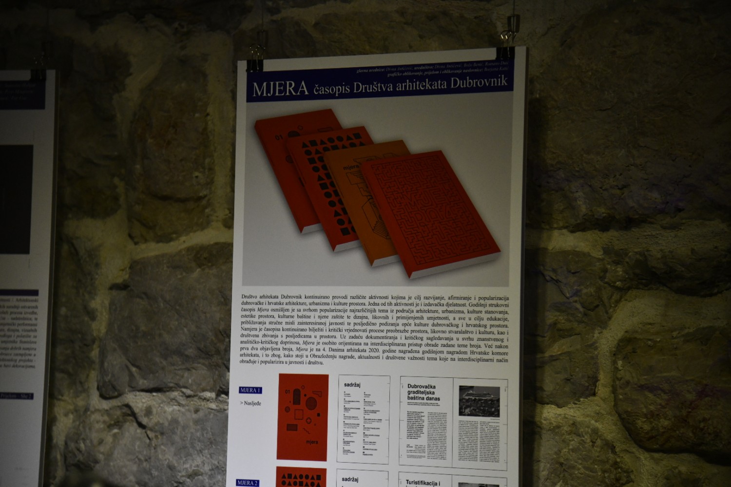 Izložba ostvarenja dubrovačkih arhitekata 2017. – 2021. predstavila je presjek rada članova Društva arhitekata Dubrovnik u proteklih pet godina. Izbor radova bio je prepušten samim autorima – arhitektima. Radovi su podijeljeni u 3 kategorije: Realizacije, Projekti i Prijedlozi, a bile su prikazane obiteljske kuće, višestambene zgrade, poslovne i javne zgrade, rekonstrukcije i dogradnje, interijer, intervencije u javnom prostoru i urbanizam, izložbe te arhitektonska publicistika. Izložba je bila dio programa Dana arhitekata 6.0. koje je Hrvatska komora arhitekata organizirala u suradnji s Udruženjem hrvatskih arhitekata. Bila je otvorena od 8. do 24. travnja 2022. U sklopu otvorenja izložbe predstavljen je 4. broj časopisa „Mjera“.